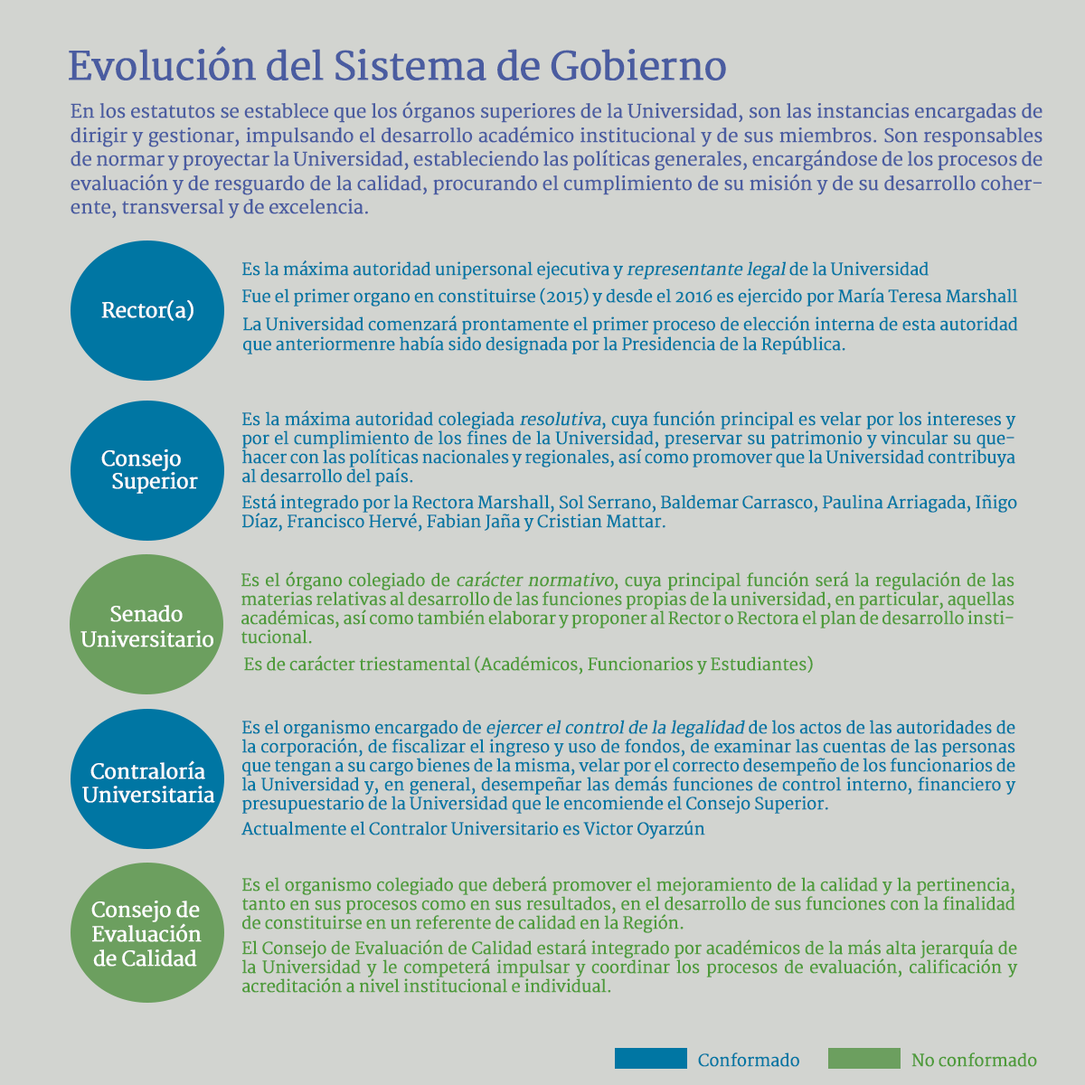 El sistema de gobierno es la forma cómo la Universidad se organiza para la toma de decisiones, a nivel central y en las distintas unidades de la institución. Para la Comisión Nacional de Acreditación, la Universidad debe desarrollar distintos mecanismos que establecen el funcionamiento del Sistema de Gobierno. Además, enfatiza que el sistema de gobierno debe ser funcional a la misión y debe ser coherente tanto con la naturaleza de la institución como con el proyecto institucional, en nuestro caso encarnado en el Plan Estratégico de Desarrollo Institucional.La misión que se ha propuesto la Universidad, es ser una institución de educación superior, estatal y autónoma, que contribuye al desarrollo nacional, con especial énfasis en la Patagonia – Aysén, a través de la formación integral de profesionales, la investigación, la creación e innovación, y la vinculación con el medio.Coherente con esta Misión, la Universidad desarrolló los estatutos que hoy la rigen, durante el año 2016, los que fueron revisados por la Universidad de Chile y por el Ministerio de Educación antes que se fijarán como Decreto con Fuerza de Ley N° 7 y fueran publicados el 4 de febrero del 2017.En los estatutos se establece que los órganos superiores de la Universidad, son las instancias encargadas de dirigir y gestionar, impulsando el desarrollo académico institucional y de sus miembros. Son responsables de normar y proyectar la Universidad, estableciendo las políticas generales, encargándose de los procesos de evaluación y de resguardo de la calidad, procurando el cumplimiento de su misión y de su desarrollo coherente, transversal y de excelencia.Los cinco órganos que componen el gobierno de la Universidad de Aysén son:1) El Rector(a), máxima autoridad unipersonal ejecutiva y representante legal de la Universidad.2) El Consejo Superior, máxima autoridad colegiada resolutiva, cuya función principal es velar por los intereses y por el cumplimiento de los fines de la Universidad, preservar su patrimonio y vincular su quehacer con las políticas nacionales y regionales, así como promover que la Universidad contribuya al desarrollo del país. Está compuesto por nueve (9) miembros. Lo preside el Rector(a), también se compone por cuatro (4) representantes del Presidente de la Republica, dos (2) representantes del Senado Universitario y dos (2) académicos, electos de conformidad a la forma en que se elige el Rector(a). Los integrantes del Consejo Superior servirán sus cargos ad-honorem, y aquellos designados en representación del Presidente o Presidenta de la República recibirán una dieta de cargo fiscal.3) El Senado Universitario, es el órgano colegiado de carácter normativo, cuya principal función será la regulación de las materias relativas al desarrollo de las funciones propias de la universidad, en particular, aquellas académicas, así como también elaborar y proponer al Rector o Rectora el plan de desarrollo institucional. Es de carácter triestamental, con el fin de construir las normas que regulan a la Universidad a partir del acuerdo y co-responsabilidad de los tres estamentos (estudiantes, académicos y funcionarios). En cuanto órgano representativo de la comunidad universitaria, está integrado, además del Rector(a) que lo preside, por 10 académicos, 2 representantes de los estudiantes y 2 representantes del personal de colaboración; todos los cuales participarán con derecho a voz y voto. Todos los integrantes del Senado Universitario servirán sus cargos ad honorem.4) La Contraloría Interna es el organismo encargado de ejercer el control de la legalidad de los actos de las autoridades de la corporación, de fiscalizar el ingreso y uso de fondos, de examinar las cuentas de las personas que tengan a su cargo bienes de la misma, velar por el correcto desempeño de los funcionarios de la Universidad y, en general, desempeñar las demás funciones de control interno, financiero y presupuestario de la Universidad que le encomiende el Consejo Superior. 5) El Consejo de Evaluación de Calidad, es el organismo colegiado que deberá promover el mejoramiento de la calidad y la pertinencia, tanto en sus procesos como en sus resultados, en el desarrollo de sus funciones con la finalidad de constituirse en un referente de calidad en la Región. Para lo anterior, ejercerá la superintendencia de la función evaluadora, que consiste en examinar, ponderar e informar sobre la calidad y cumplimiento de las tareas universitarias. La función evaluadora se aplica tanto a las estructuras como a los académicos que las integran, mediante normas, procesos y criterios debidamente reglamentados, y resguardando la especificidad, características y diversidad de las actividades. El Consejo de Evaluación de Calidad estará integrado por académicos de la más alta jerarquía de la Universidad y le competerá impulsar y coordinar los procesos de evaluación, calificación y acreditación a nivel institucional e individual.La Universidad de Aysén se encuentra en un proceso de instalación progresiva de sus capacidades y del sistema de gobierno definido en el Estatuto, por lo que se espera que, en un horizonte de mediano plazo, constituya todos los órganos definidos, hasta llegar a un estado en régimen. Ello ha quedado expresamente establecido en el objetivo estratégico N° 19 del PEDI, que busca garantizar el funcionamiento de los órganos superiores de Gobierno Universitario, generando la normativa para su elección y funcionamiento, así como también generando las condiciones de instalación y operación de los mismos.En la actualidad están en funcionamiento tres de los cinco órganos de gobierno. El primero en constituirse fue el de Rectora, con el nombramiento de Roxana Pey en septiembre del 2015 y posteriormente con la actual autoridad universitaria, María Teresa Marshall en agosto del 2016.En el año 2017 se conforma el Consejo Superior, que está integrado por la Rectora 