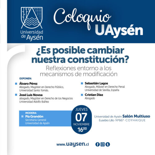 En las dependencias del Campus Lillo de la Universidad de Aysén un panel de expertos presentará a la comunidad en general distintas visiones sobre los mecanismos de modificación de la carta fundamental de nuestro país. Con la finalidad de generar diálogos, análisis y reflexiones en el marco de la contingencia político social que enfrenta el país, la Universidad de Aysén organizó un coloquio abierto a la comunidad llamado “¿Es posible cambiar nuestra Constitución?, reflexiones entorno a los mecanismos de modificación”, actividad que se realizará el jueves 7 de noviembre a las 16:00 horas en el Campus Lillo de la casa de estudios. En la oportunidad, el conversatorio será moderado por la Secretaria General de la Universidad de Aysén, la abogada Pía Grandón Cárdenas, y participarán en el panel de expertos los abogados Cristián Díaz; Álvaro Pérez, magíster en Derecho Público de la Universidad Santo Tomás y asesor de la Fiscalía Regional de Aysén; José Luis Novoa, magíster en Derecho de los Negocios de la Universidad Adolfo Ibáñez y Sebastián Lagos, máster en Derecho Penal de la Universidad de Sevilla, España. Al respecto, María Patricia Baeza, directora de Vinculación con el Medio de la Universidad de Aysén, señaló que la casa de estudios se ha propuesto abrir espacios para generar diálogos y reflexiones entre diferentes actores de la sociedad como lo son funcionarios, académicos, estudiantes de educación superior, secundarios, dirigentes sociales y comunidad en general. “En ese mismo marco es donde hemos venido realizando una serie de actividades abiertas a la comunidad y también actividades internas propias de la universidad orientadas a cumplir con estos objetivos, por lo que este jueves vamos a tener este conversatorio constituido por un panel de abogados quienes nos van a entregar los elementos de análisis de lo que implica, por ejemplo, tener un cambio hacia una nueva constitución y los mecanismos que adhieren a este tipo de procesos que han vivido diversos países”, puntualizó. Por su parte, uno de los expositores del Coloquio “¿Es posible cambiar nuestra Constitución?, reflexiones entorno a los mecanismos de modificación”, el abogado Álvaro Pérez, expresó la importancia de reflexionar sobre la carta fundamental y sus implicancias. “Las constituciones son llamadas la ley fundamental, ahí encontramos un primer atisbo de lo importante que es para el país, son importantes porque en ellas se modulan las bases de la institucionalidad y junto con ello, se consagran todos los derechos y deberes que se garantizan a todas las personas. Además, en las constituciones podemos encontrar elementos fundamentales, por ejemplo, la conformación, la designación y las atribuciones que tienen las distintas autoridades y organismos públicos de nuestro país, como el Presidente de la República, el Congreso Nacional, el Ministerio Público, la Contraloría General de la República y el Poder Judicial, vale decir, una constitución nos entrega la forma en que el poder del Estado se puede ejercer”, explicó.Universidad de Aysén organiza coloquio ¿Es posible cambiar nuestra sobre Constitución?