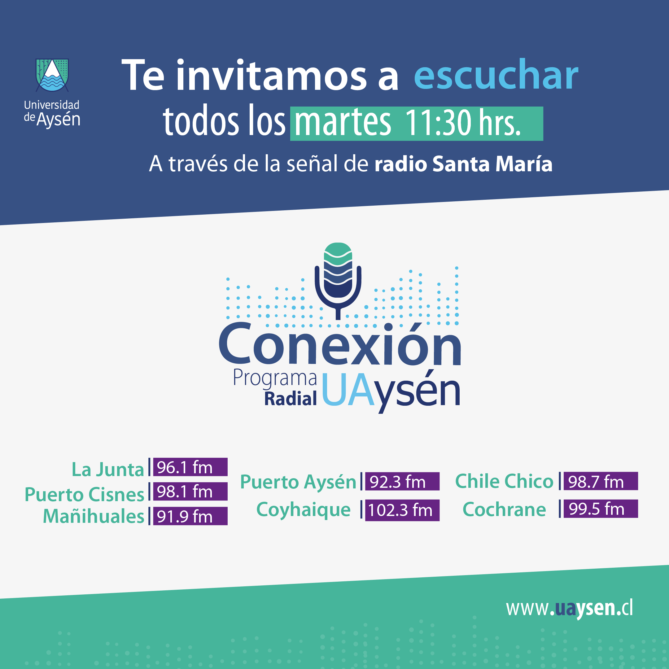 El espacio radial de la Universidad de Aysén se transmitirá cada martes a las 11:30 a través de la señal de radio Santa María. Todo el quehacer universitario, noticias, entrevistas, opinión, investigación y la agenda de actividades de la Universidad de Aysén es lo que trae la nueva temporada de Conexión UAysén, espacio radial semanal