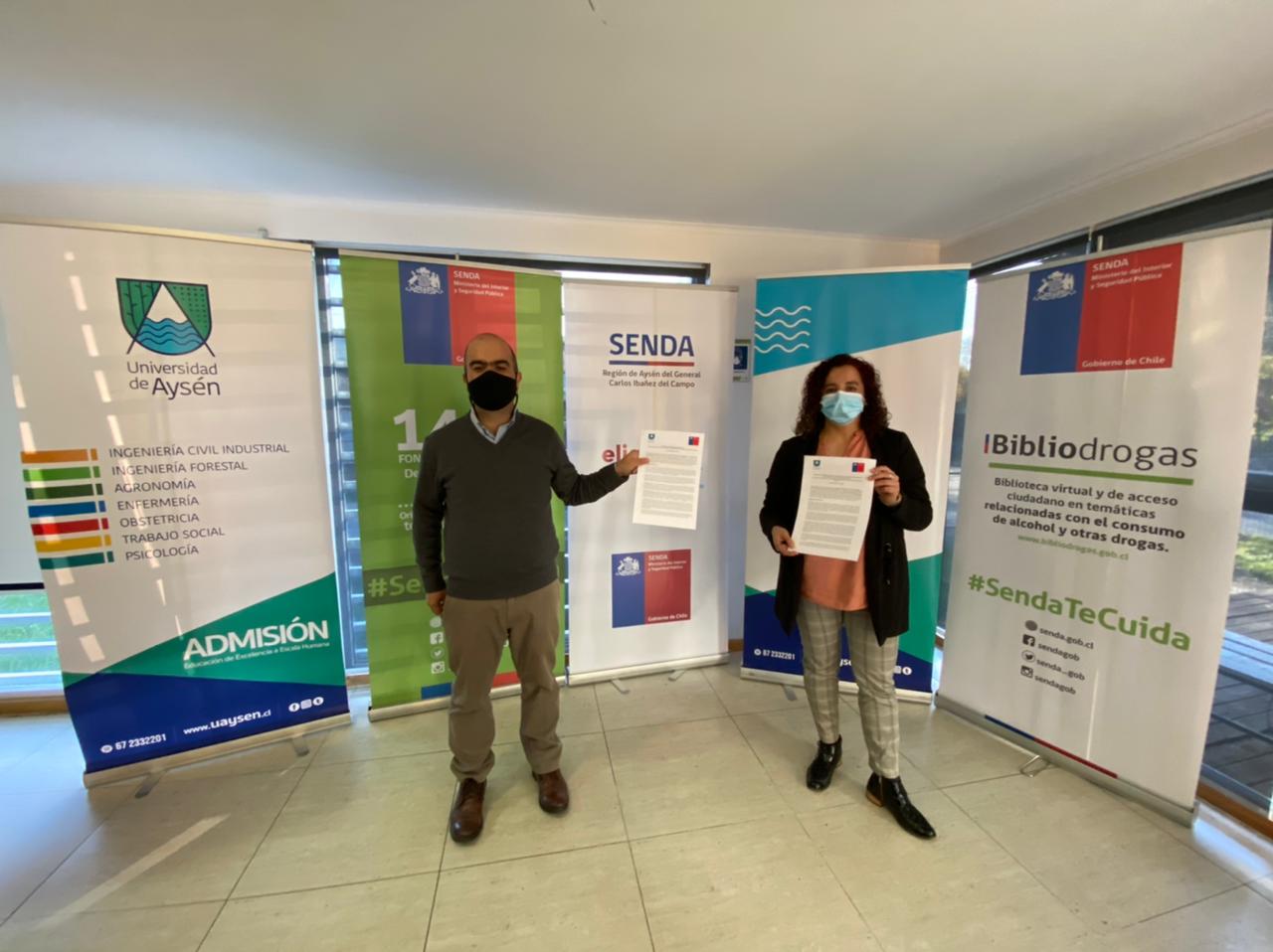 La Universidad de Aysén y el Servicio Nacional para la Prevención y Rehabilitación del Consumo de Drogas y Alcohol (Senda), firmaron un convenio de colaboración técnica que permitirá la derivación de posibles casos de consumo de alcohol o drogas, para brindar información y apoyo psicosocial, a través del programa Fonodrogas 1412.