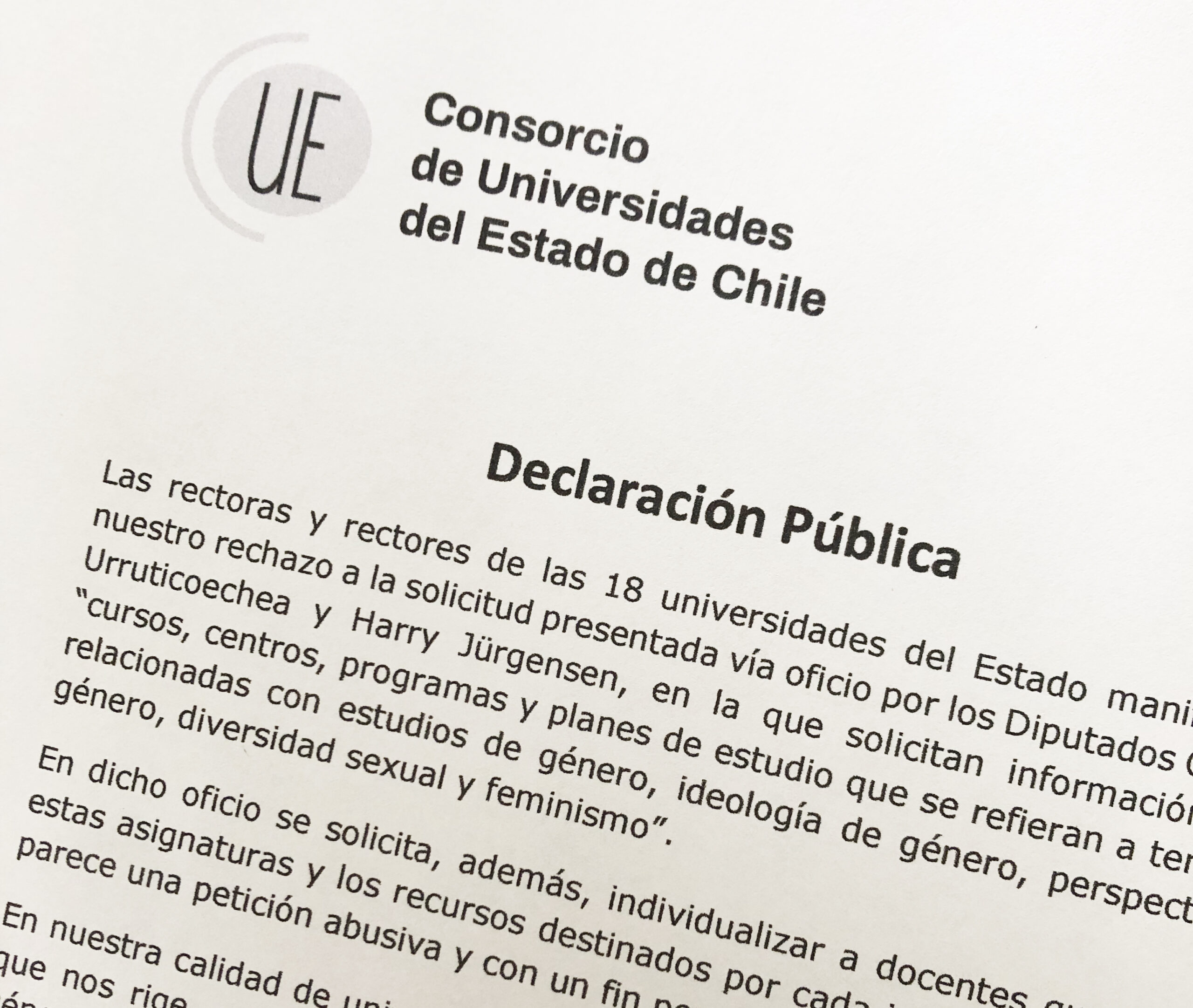 Las rectoras y rectores de las 18 universidades del Estado manifestamos nuestro rechazo a la solicitud presentada vía oficio por los Diputados Cristobal Urruticoechea y Harry Jürgensen, en la que solicitan información sobre “cursos, centros, programas y planes de estudio que se refieran a temáticas relacionadas con estudios de género, ideología de género, perspectiva de género, diversidad sexual y feminismo”.