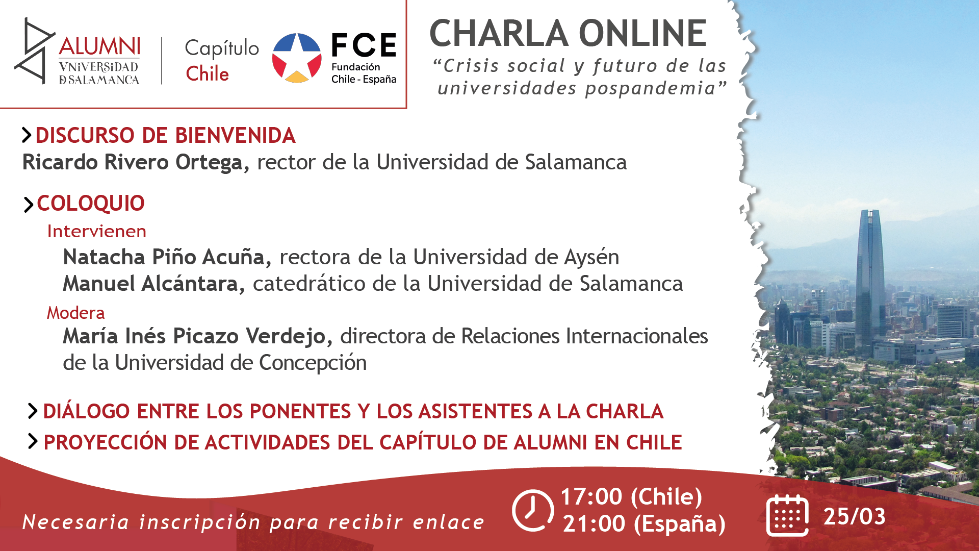 El próximo 25 de marzo (17:00 hora de Chile, 21:00 hora de España) se celebrará el primer evento organizado por el capítulo de Chile de Alumni de la Universidad de Salamanca. Se tratará de una charla con primeras figuras de la vida política y académica chilena y española en torno al tema “Crisis social y futuro de las universidades pospandemia”.