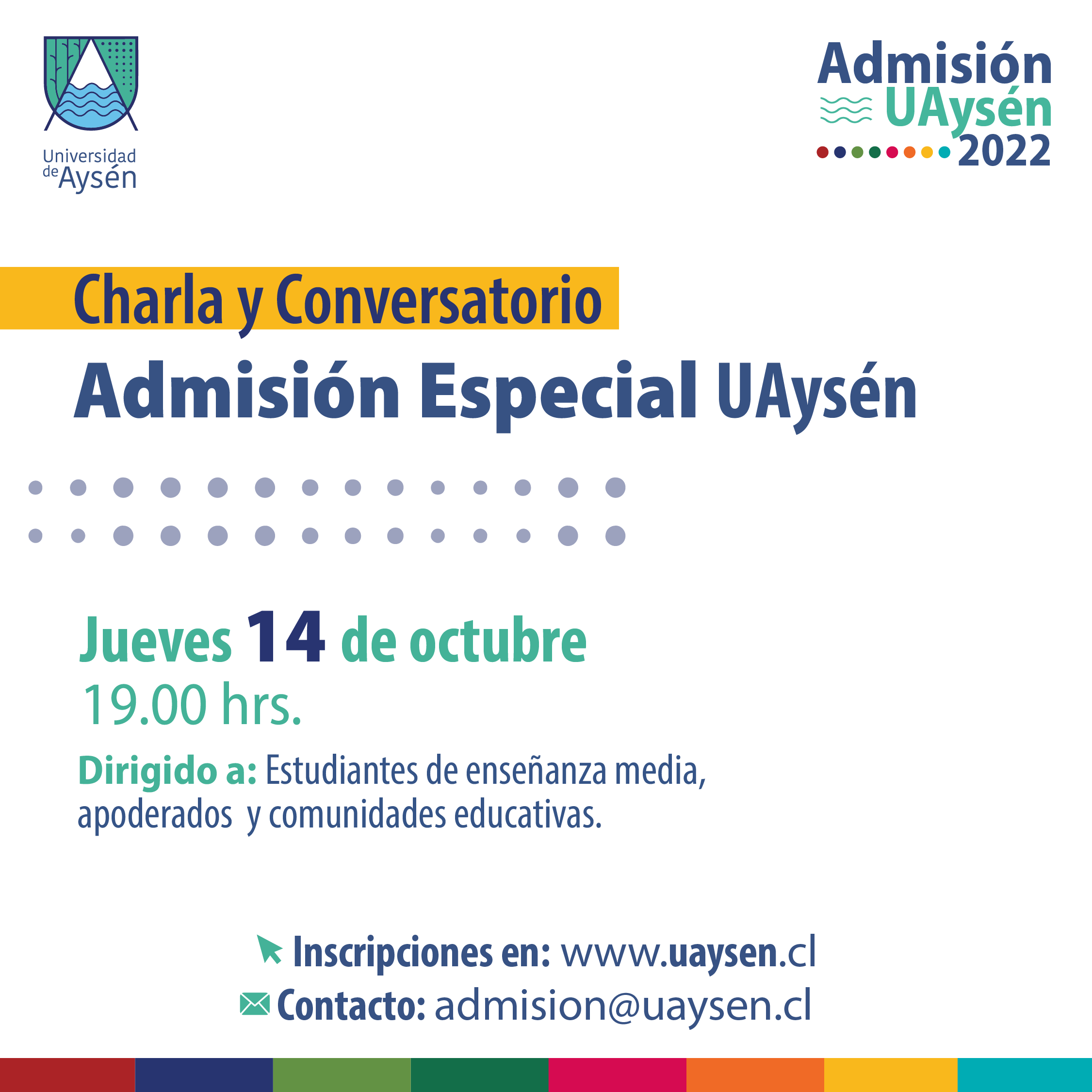 Te invitamos a una charla y conversatorio virtual en la que les informaremos sobre los requisitos y criterios de postulación para la Admisión Especial UAysén ¡No te la pierdas! El jueves 14 de octubre a las 19:00 horas