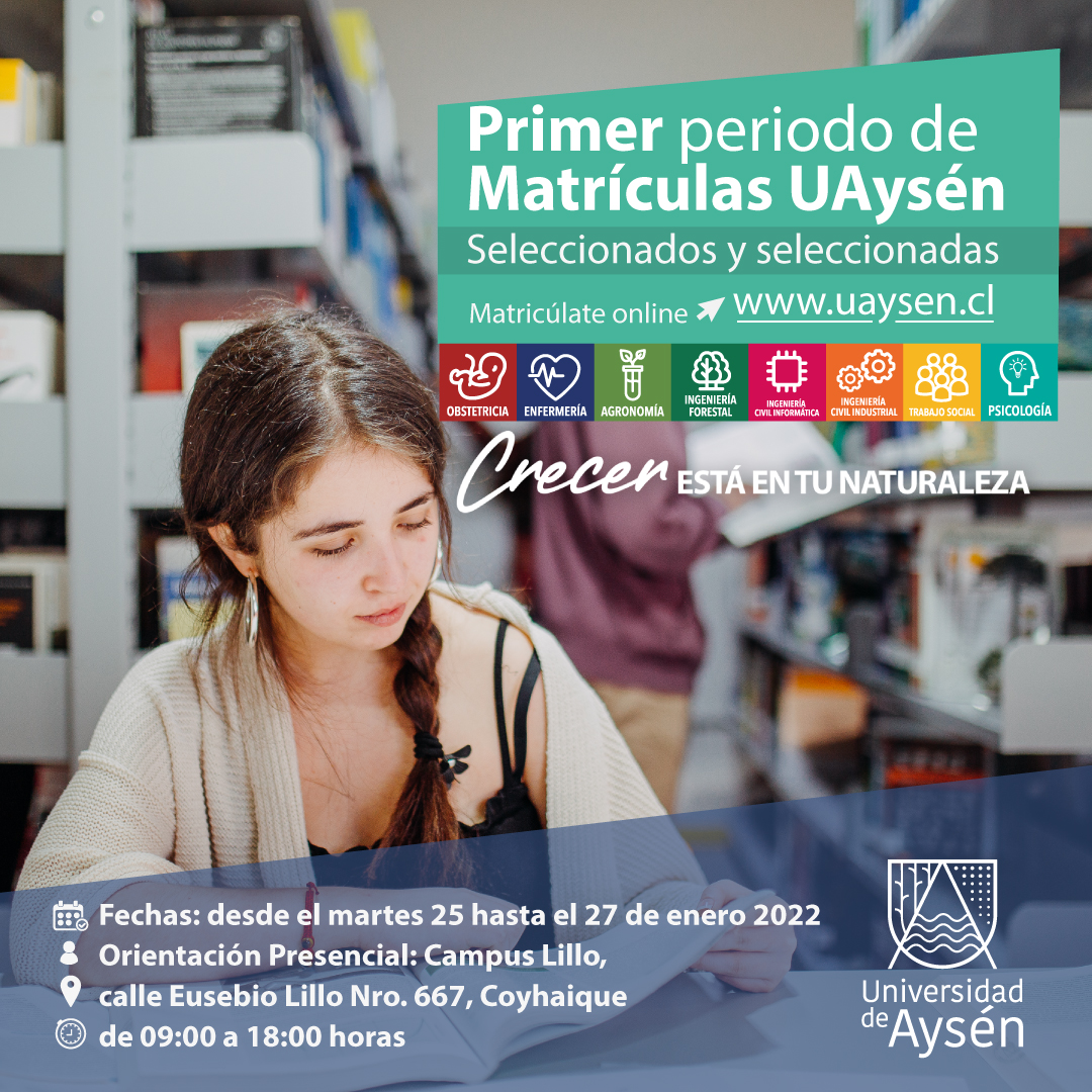 Desde el martes 25 hasta el viernes 27 de enero a las 18:00 horas se encuentra abierto el Primer Periodo de Matrículas, si quedaste seleccionado o seleccionada en la UAysén y no te matriculas, puedes perder tu vacante.