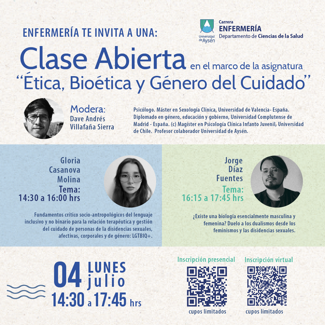 En un contexto donde las diversidades y disidencias sexuales, afectivas, corporales y de género (LGBTIQA+) están enseñándonos nuevos modos de organizar nuestras relaciones, la carrera de enfermería, interesados de acercar a la comunidad temáticas que contribuyen al desarrollo del territorio y sus personas, quiere invitarle a una clase abierta en el marco de la asignatura “Ética, Bioética y Género del Cuidado”