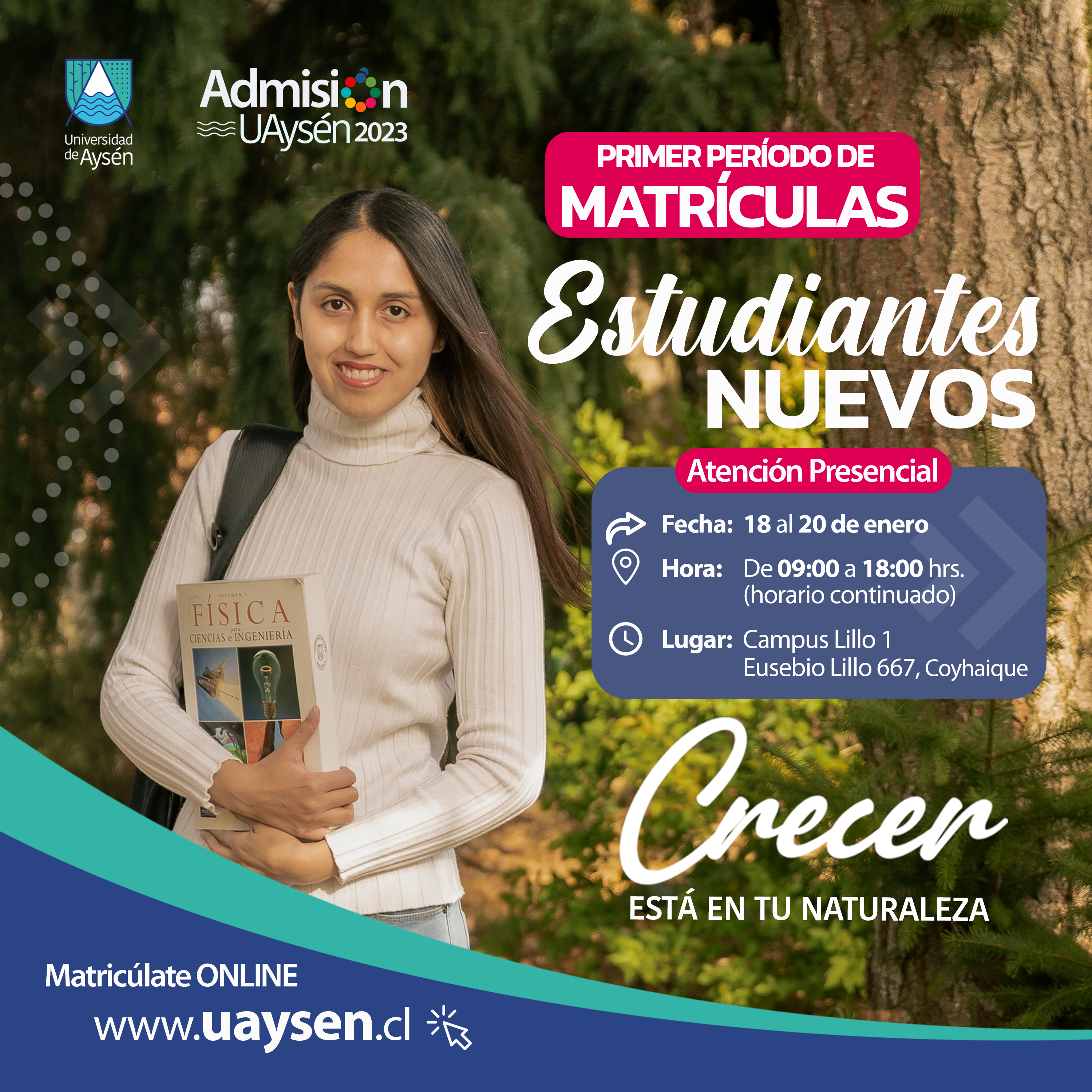 Informamos que el primer periodo de Matrículas para Nuevos/as Estudiantes UAysén se realizará en el sitio www.uaysen.cl del 18 al 20 de enero. No obstante, contamos con orientación presencial en el Campus Lillo 1, ubicado en Calle Eusebio Lillo #667, Coyhaique en horario de atención presencial de 09:00 a 18:00 horas.