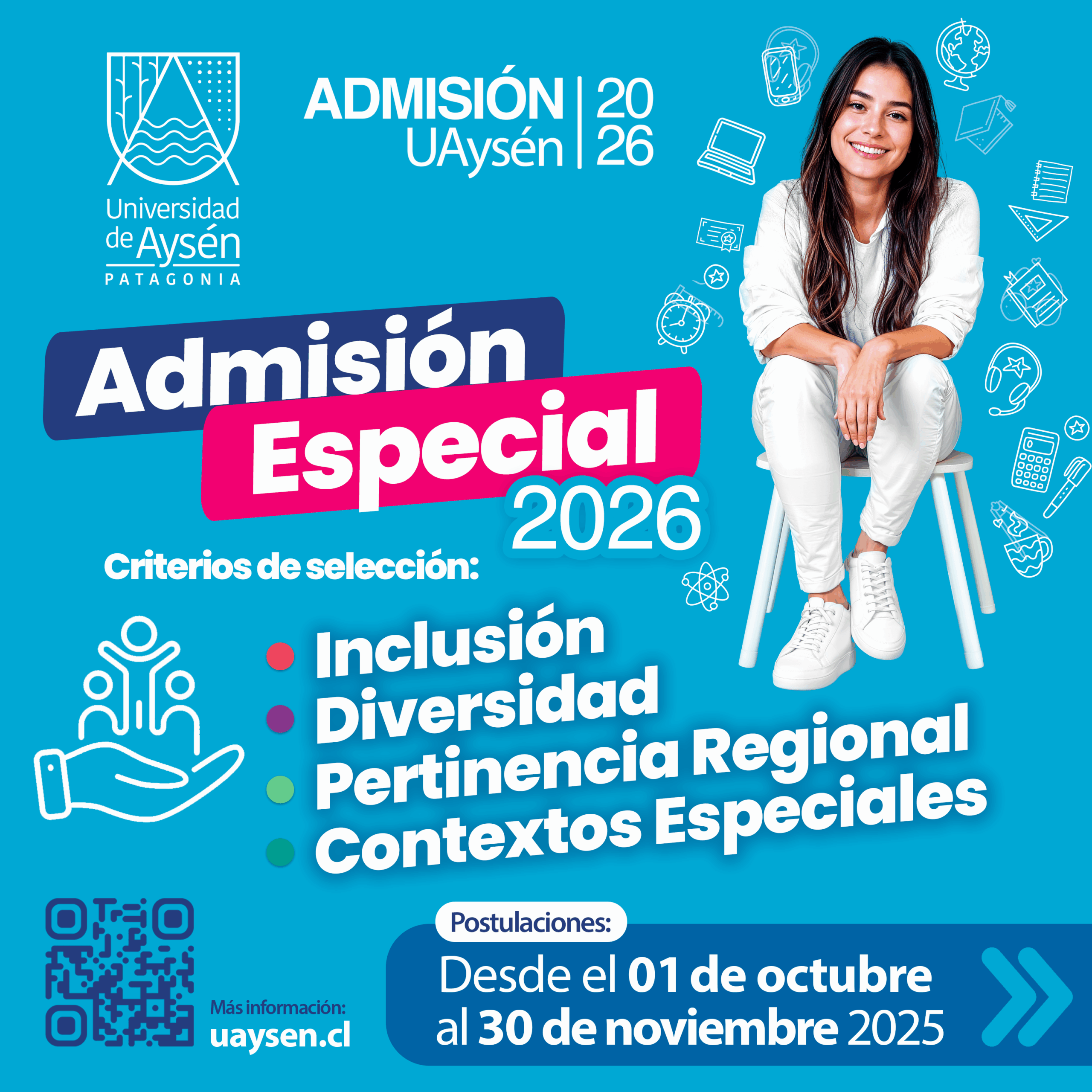 Hasta el 30 de noviembre del 2025 se puede postular a la Admisión Especial UAysén 2026, la cual contempla cuatro criterios de selección: Inclusión, Diversidad, Pertinencia Regional y Contextos Especiales. Este proceso permite postular a personas con talentos deportivos, culturales o académicos destacados, jóvenes de establecimientos educacionales de zonas extremas, integrantes de pueblos originarios, personas en situación de discapacidad o quienes enfrenten contextos personales particulares. Además, la universidad podrá ampliar el proceso durante el mes de diciembre para aquellas carreras que lo requieran.