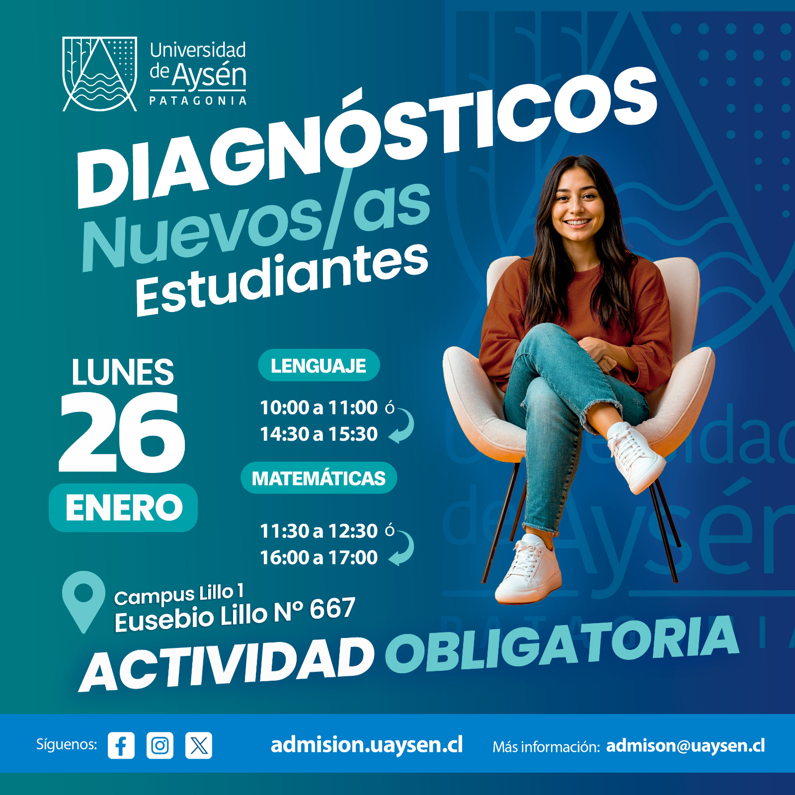 ¡Atención nuevos y nuevas estudiantes UAysén 2026! Les invitamos a participar de los Diagnósticos de Lenguaje y Matemáticas, que forman parte del inicio de su trayectoria universitaria en la Universidad de Aysén. Para facilitar su participación, se disponen de dos horarios a elección, para que puedan asistir en el bloque que mejor se ajuste a su jornada. Lunes 26 de enero Campus Lillo 1 – Eusebio Lillo N°667 Lenguaje * 10:00 a 11:00 hrs o * 14:30 a 15:30 hrs Matemáticas * 11:30 a 12:30 hrs o * 16:00 a 17:00 hrs Actividad obligatoria