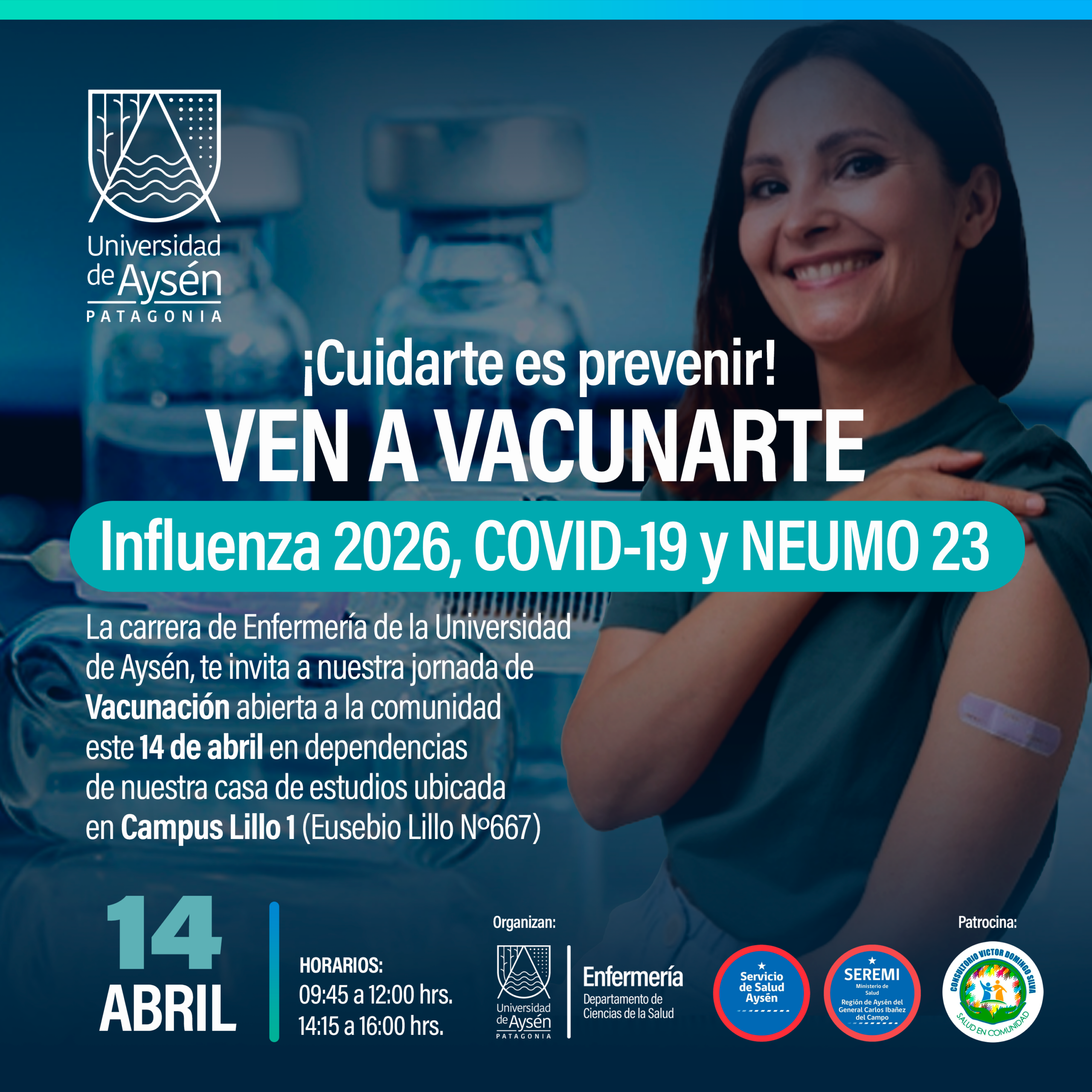 La carrera de Enfermería de la Universidad de Aysén invita a la comunidad a participar de la jornada de vacunación gratuita contra Influenza 2026, COVID-19 y Neumo 23, que se realizará hoy 14 de abril en Campus Lillo 1 (Eusebio Lillo N°667).