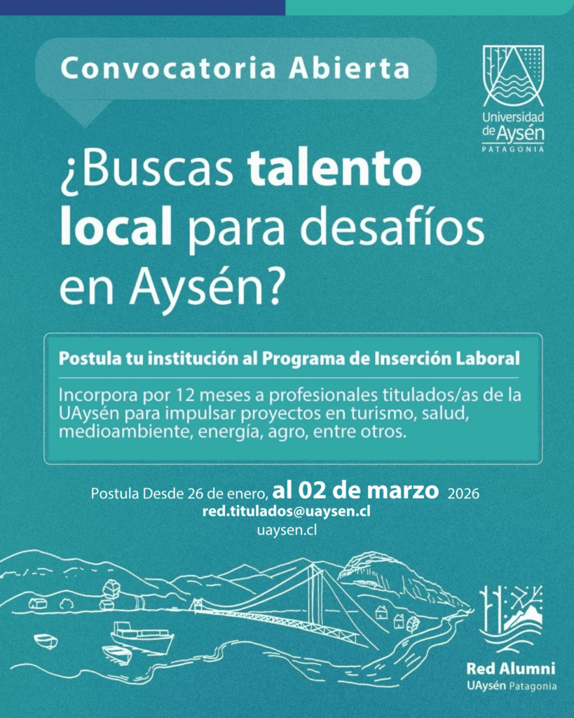 En caso de consultas, contactar por medio del correo red.titulados@uaysen.cl o a la Profesional de Vinculación con el Medio y Coordinadora de la Red Alumni, Kharim Oñate (kharim.onate@uaysen.cl)