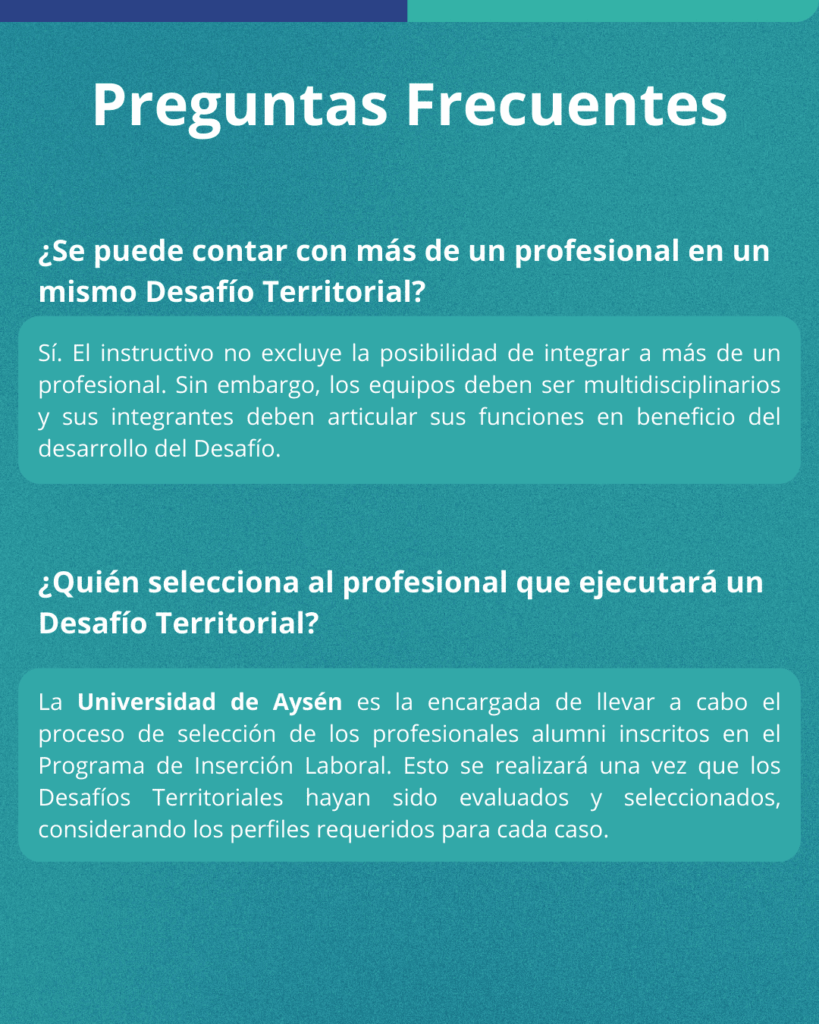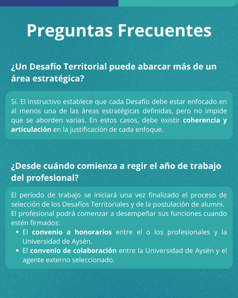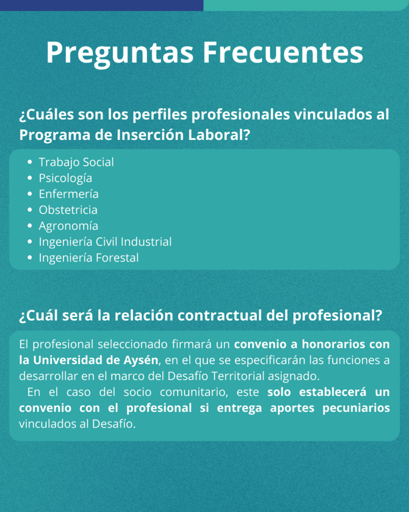 Los Desafíos Territoriales para la Inserción Laboral, serán iniciativas que propenden a resolver necesidades, problemas u oportunidades que afectan o que impactan la calidad de vida de las localidades y habitantes de la Región de Aysén. Los cuales serán detectados por los agentes externos que requieren apoyo de profesionales capacitados y formados por la Universidad de Aysén. La Universidad, con el propósito de potenciar la identidad regional mediante el desarrollo de conocimiento y la formación de profesionales, y en coherencia con su énfasis territorial en la descentralización, la valoración de las comunidades locales y de todo el territorio regional, contribuirá a la resolución de estos Desafíos Territoriales mediante la contratación de profesionales titulados de la propia institución (alumni).